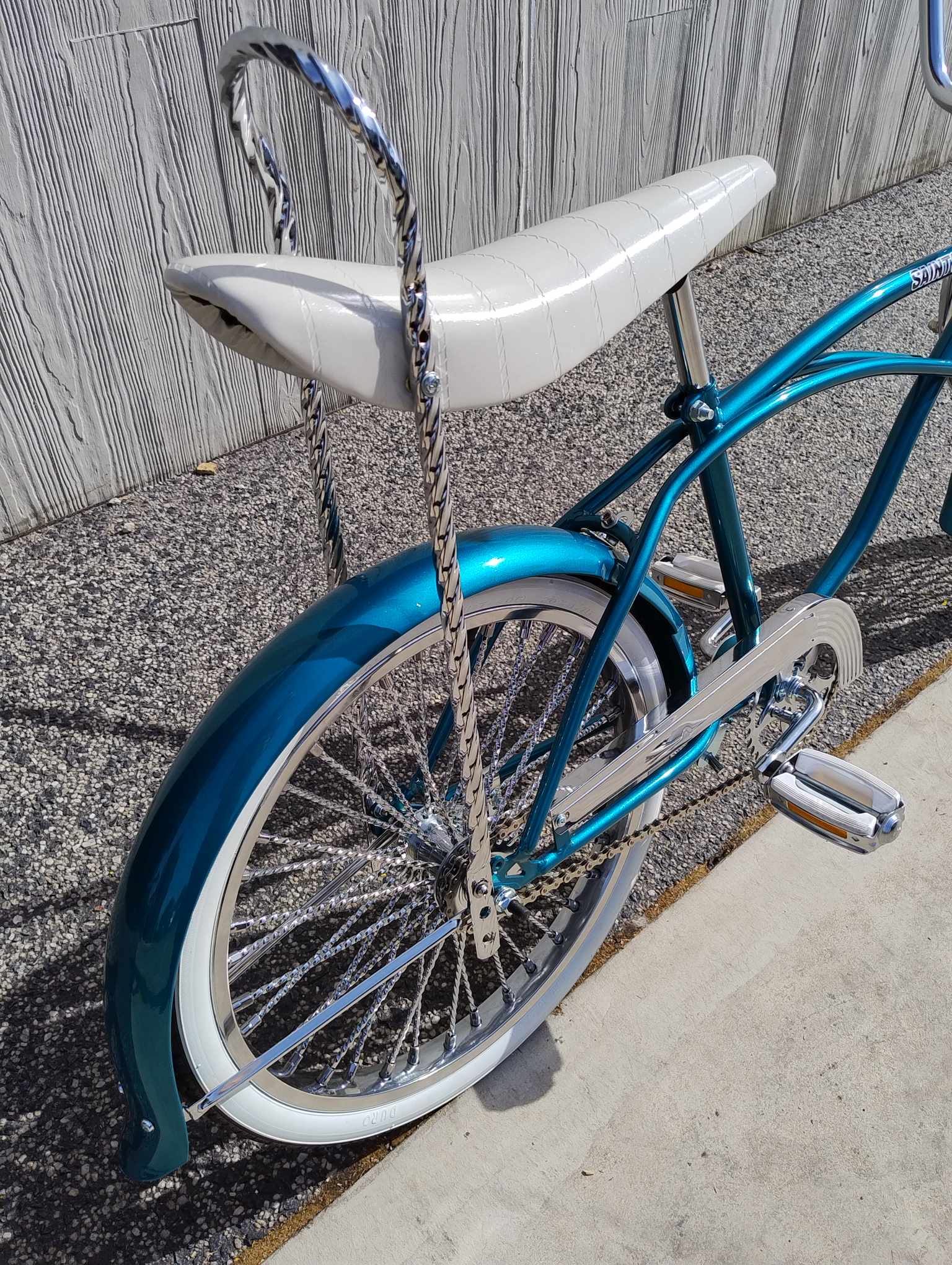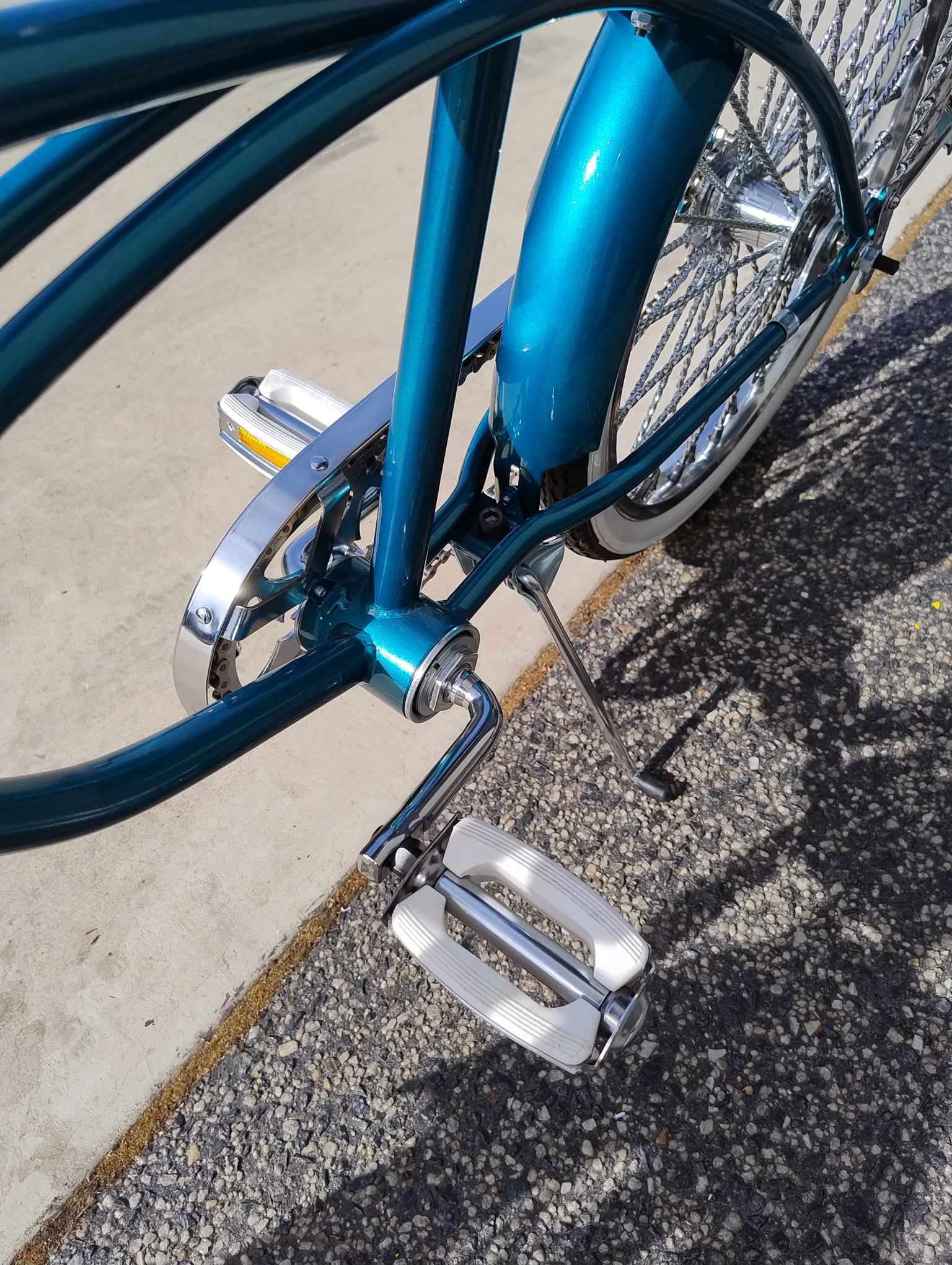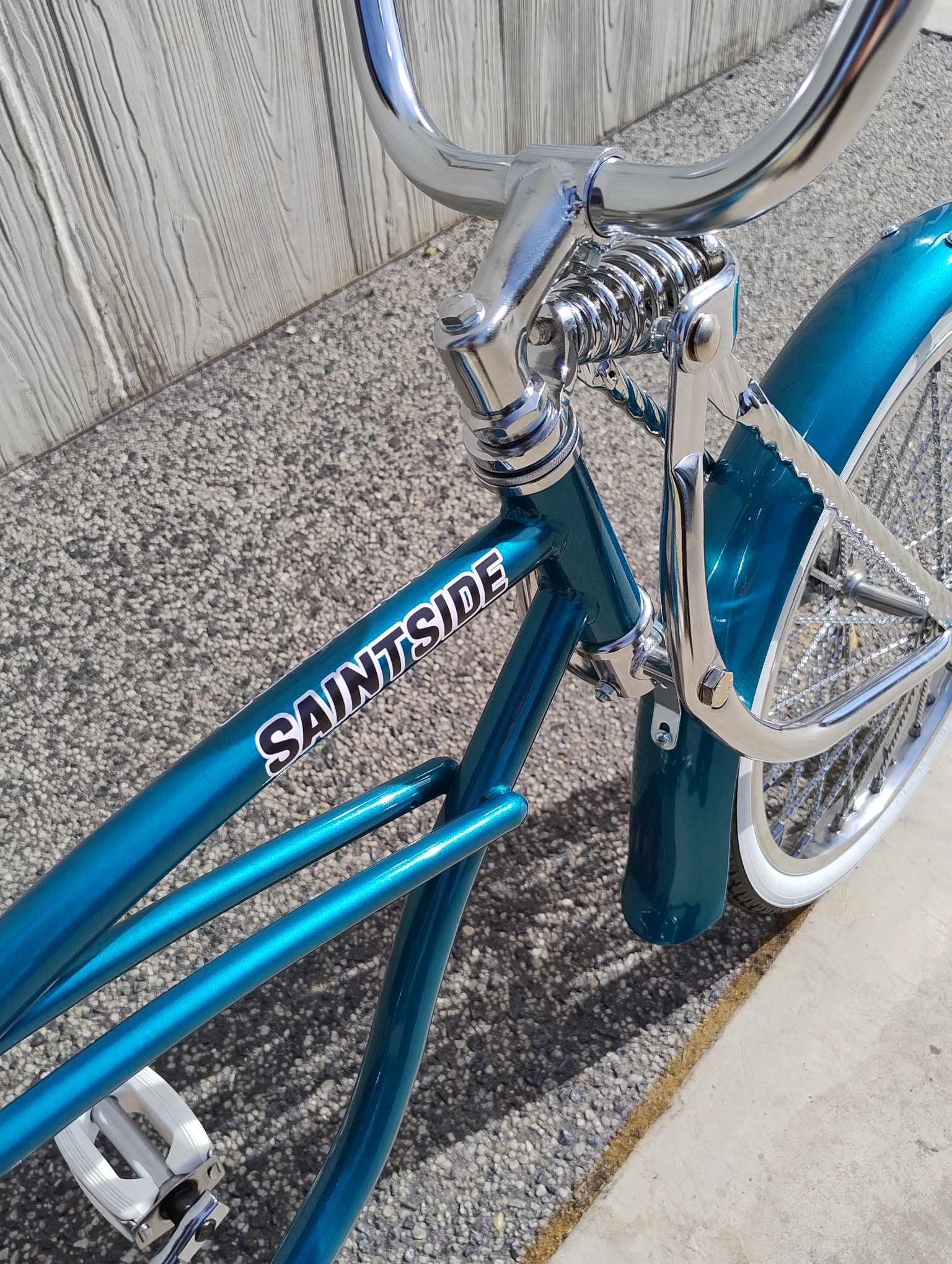 Custom mix metallic teal custom paint work across frame, front and rear guard, and a lowrider style build balanced with square twist chrome parts, set off by chrome twisted 36 spoke chrome rims.