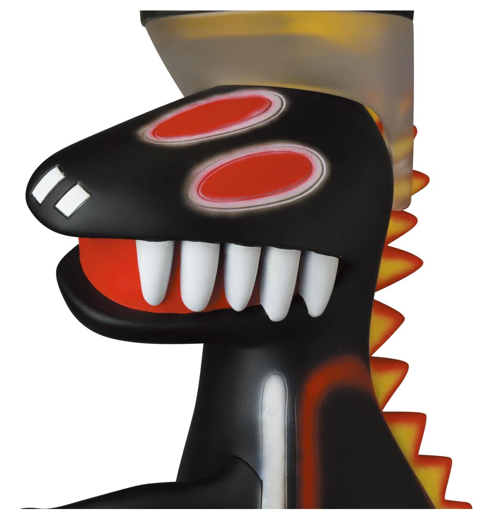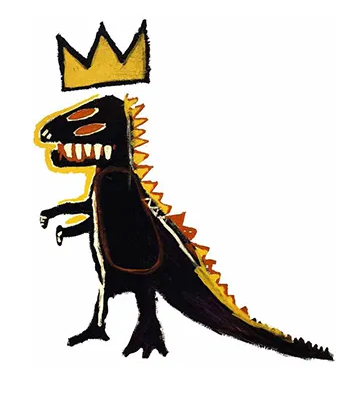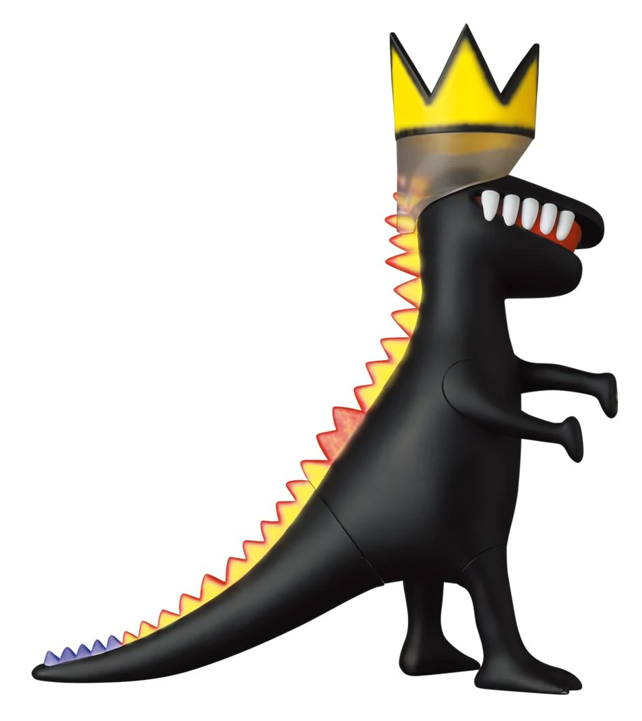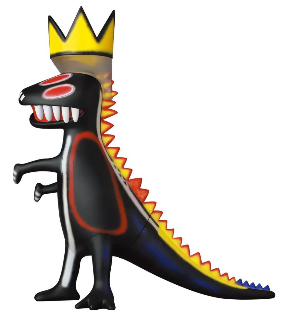 Vinyl, and now rounded in 3D, standing at a large 250mm and weighing 700 grams. Basquiat's Dinosaur references the original artworks of the "Pez Dispenser" created in 1984 by Basquiat. This vinyl doll models the blend of colours on a black dinosaur wearing a crown, encompassing his signature style of street art elements with complex, neo-expressionist style.