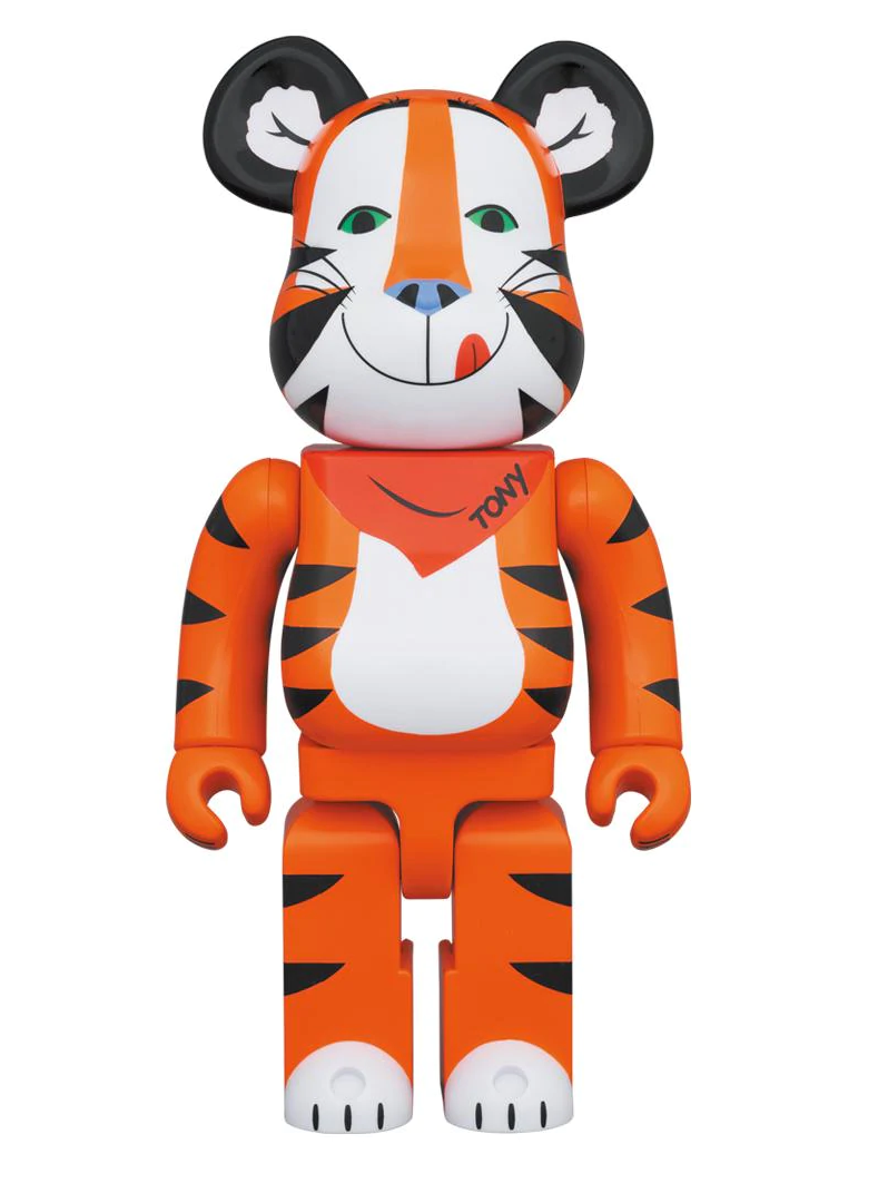 Destined to become the offical mascot of the Kellogg's Brand, beating all competition and designed by former Disney Animators, Tony The Tiger made breakfast time "Grrrrrrreat" and changed the way children viewed eating first thing in the morning. From the 1950's til today, Tony is recognisable and his voicer overs distinguishable, and is famous for being front and centre of the Frosted Flakes box, among cartoons, comics, animations, toys, clothing and more. Americana branding at it's greatest, and he looks fantastic as the 50s retro version displayed on the Bearbrick medium.