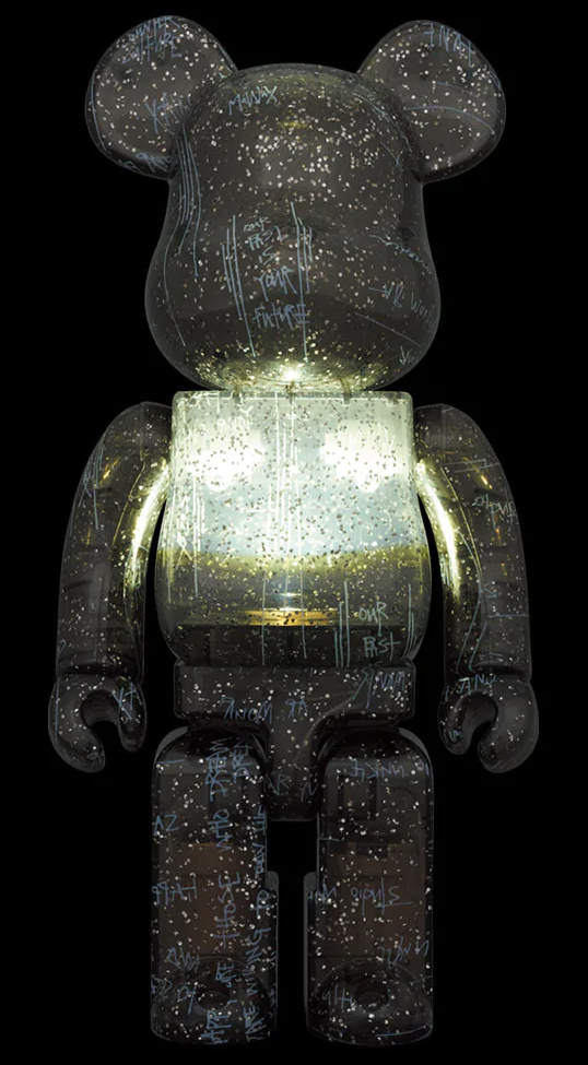 UNKLE the British born trip hop music group founded by legendary James Lavelle and Studio Ar.Mour twist up this graphically spaced out style Bear with art work sprawls amongst the body and limbs, but also an internal light in the belly of the bear, revealing a new purpose in.. night light, ambient addition, or energising the pattern and artwork the bear is carrying, with more purpose.