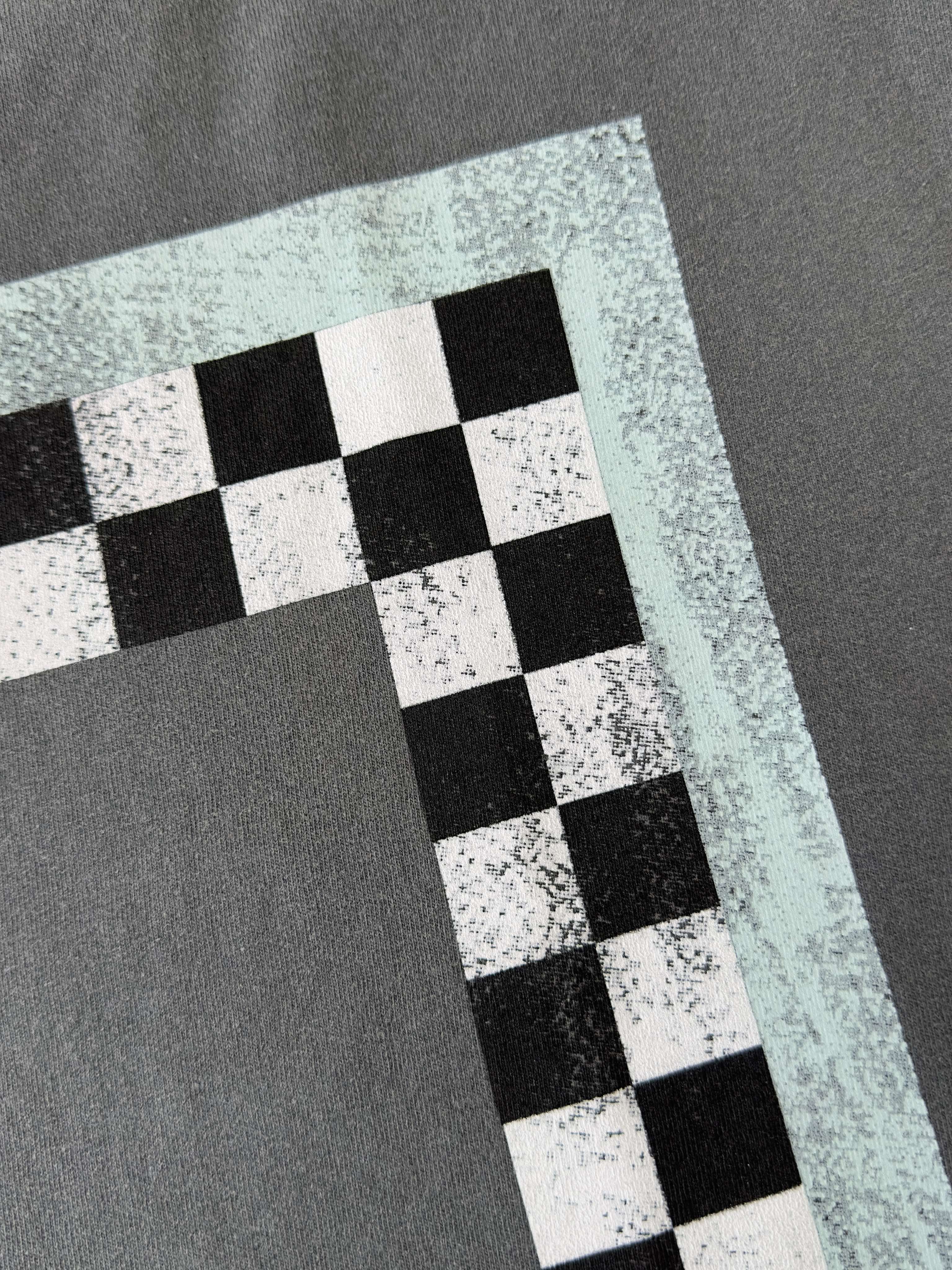 Featuring a worn look print checker tile on the rear of the t-shirt only, with the clean front to wear with anything. Each t-shirt featuring a different outer tile colour. The idea is to make nicer garments that are simple, striking, without emblazoned logos all over the place. With this garment dyed, enzyme washed t-shirt, after the first wash the garment becomes soft and the wear of the print joins the feel of a garment that is brand new, but has a total vintage feel, like an item of clothing that is years older than it is.