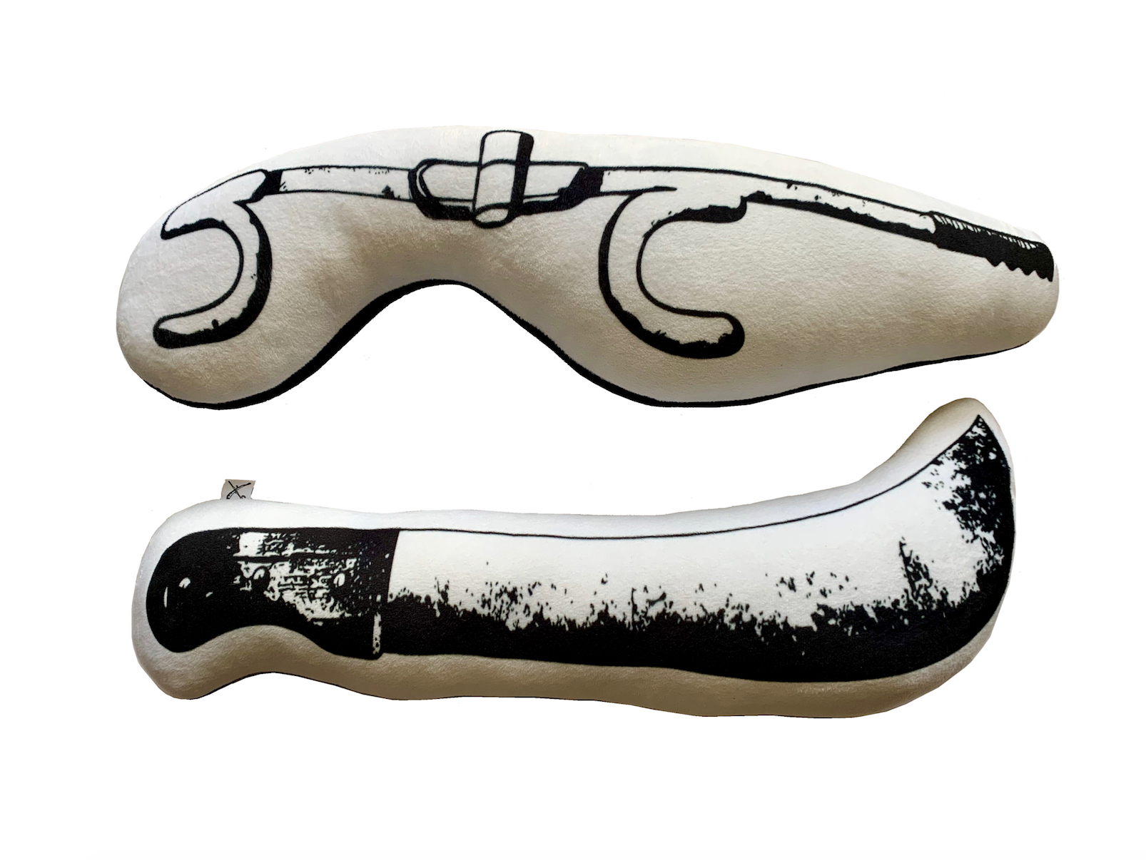 Includes two cushions, one shaped as a machete, the other as a club lock car security bar.